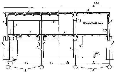 Рис. 27. Пример конструктивного решения подвального помещения с техническим этажом 1 - колонна; 2 - ригель; 3 - панель перекрытия; 4 - панель междуэтажного перекрытия; 5 - панель стеновая; 6 - фундаментная стена (монолитная); 7 - балка обвязочная (монолитная); 8 - поперечные координационные оси подвала; 9 - то же, продольные 10.36. Наибольшее распространение в промышленном строительстве получили конструктивные решения подвалов в виде каркасной схемы с вертикальными плоскими стеновыми панелями и опирающимися на них ребристыми плитами. В многопролетных подвалах применяются сборные железобетонные ригели и прямоугольные колонны.