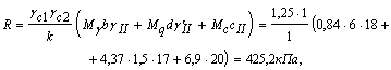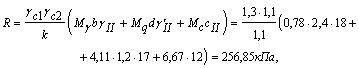 где gс1 = 1,25; gс2 = 1 (по табл. 6); k = 1 (по п. 6.15); Мg = 0,84; Мq = 4,37; Мс = 6,9 (по табл. 7 при jII = 26°); d = 1,5 м. Угол наклона плоскости обрушения к вертикали