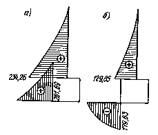 Рис. 7. К расчету уголковой подпорной стены составного сечения а - эпюры моментов; б - эпюры поперечных сил Q3 –3 = pmax(3c0 - b + x3)2/6c0 - Pugx3 - Pugx3 - Puq(x3 - x) - x32(P'ug - P'ug)/2(b - t) = = 278,81(3×1,23 - 3,9 +2,2)2/6×1,23 - 117,96×2,2 - 30,17(2,2 - 0) - 2,22(122,4 - -117,96)/2(3,9 - 0,7) = -179,63 кН. Эпюры моментов и поперечных сил см. на рис. 7. Определение усилий в щелевом пазе Горизонтальные и вертикальные составляющие (рис. 8) внутренней пары определяем по формулам п. 6.22: Pr = Mt - 1sin2a/0,75l = 234,26sin253°30'/0,75×0,9 = 224,23 кН; Pв = M1 -1sina × cosa/0,75l = 234,26sin53°30' cos 53°30'/0,75×0,9 = 165,76 кН, где tga = 0,75l/h = 0,75×0,9/0,5 = 1,35; a = 53°30'.