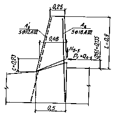 Рис. 10. К расчету левой стенки щелевого паза Прочность сечения правой стенки паза на действие поперечной силы обеспечена. 2. На действие изгибающего момента M4 - 4 = 286,8 кН×м: aM = M4 - 4/Rbbh02 = 286,8/8,5×103×1×0,512 = 0,13, где h0 = 0,55 - 0,44 = 0,51 м. По табл. 18 Пособия по проектированию бетонных и железобетонных конструкций из тяжелых и легких бетонов без предварительного напряжения арматуры (к СНиП 2.03.01-84*) (М.: ЦИТП, 1986) для бетона класса В 15 и арматуры класса АIII при gb2 = 1 находим aR = 0,426. Так как aM=0,13<aR=0,426, то сжатие арматуры по расчету не требуется. По табл. 20 вышеперечисленного Пособия при aM=0,13 находим v=0,93. As = M4 - 4/Rsvh0 = 286,8/3,65×105×0,93×0,51 = 1,656×10-3 м2 = 16,56 см2. Принимаем стержни Æ 22 АIII с шагом 200 мм (As = 19 см2). Сжатую арматуру принимаем конструктивно Æ 12 AIII шаг 200 мм (рис. 11). Расчет левой стенки паза Расчет стенки производим, как расчет внецентренно растянутого элемента. 1. На действие поперечной силы Q5 - 5 = 224,23 кН при действии растягивающей силы N5 - 5 = 165,76 кН: а) проверяем выполнение условия (1): Q5 - 5 = 224,23 кН < 0,3×1×0,915×8,5×103×1×0,44 = 1026,63 кН, где ho = (0,5 + 0,46)/2 - 0,04 = 0,44 м (условие выполнено); б) проверяем условие (2): Q5 - 5 = 224,23 кН < 1,5(1 - 0,1)7,5×102×1×0,442/0,23 = 852,26 кН, где jn = -0,2N5 - 5/Rbtbho = -0,2×165,76/7,5×102×1×0,44 = -0,1. c = 0,23 м - длина проекции наклонного сечения на продольную ось стенки (рис. 10). Условие выполнено, но при этом величина значения правой части неравенства превышает величину 852,26 кН > 2,5Rbtbho = 2,5×7,5×102×1×0,44 = 825 кН. Поэтому несущую способность сечения принимаем равной 825 кН. 2. На действие изгибающего момента M5 - 5 = 71,71 кН×м и растягивающей силы N5 - 5 = 165,76 кН: ho = 0,46 - 0,04 = 0.42 м. Определяем эксцентриситет действия растягивающей силы eo = M5 - 5/N5 - 5 = 71,71/165,76 = 0,432 м; e = eo - h/2 + a = 0,432 - 0,46/2 +0,04 = 0,242 м; e' = eo + h/2 - a' = 0,432 + 0,46/2 - 0,04 = 0,622 м. Так как e' = 0,622 м > ho - a' = 0,42 - 0,04 = 0,38 м, определяем необходимую площадь растянутой арматуры по значению aм, вычисленному по формуле aм = [N5-5e - RscAs'(ho - a')]/Rbbho2 = [165,76×0,242-3,65×105×5,65×10-4 × ×(0,42 --0,04)]/8,5×103×1×0,422 = -0,026 < 0, где As' - принята конструктивно Æ 12AIII с шагом 200 мм (5Æ12 AIII, As' = 5,65 см2 = 5,65×10-4 м2). Так как aм < 0, площадь сечения растянутой арматуры определяем по формуле As = N5 - 5e'/Rs(ho - a') = 165,76×0,622/3,65×105(0,42 - 0,04) = 7,43×10-4 м2 = 7,43 см2. Требуется на 1 м 5 Æ 14 AIII As = 7,69 см2. Однако по условиям конструирования (рис. 11), принимаем 5Æ 22 AIII (As = 19 см2). Расчет нижнего сечения Расчет производим, как внецентренно растянутого элемента на изгибающий момент М6-6 =296,93 кН×м и растягивающую силу N6-6 = 354,08 кН: h0 = 0,6 - 0,04 = 0,56 м; е0 = 296,93/354,08 = 0,839 м; е = е0 - h/2 + a = 0,839 - 0,6/2 + 0,04 = 0,579 м; е¢ = е0 + h/2 - a¢ = 0,839 + 0,6/2 - 0,04 = 1,099 м; Так как е¢ = 1,099 м > h0 - а¢ = 0,56 - 0,04 = 0,52 м, определяем необходимую площадь растянутой арматуры по значению aм, вычисленную по формуле
