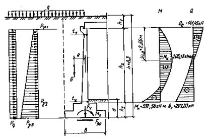 Рис. 14. Схема загружения подпорной стены при расчете на прочность а) - эпюра изгибающих моментов; б) - эпюра поперечных сил Сечение 1 - 1 (при y = h = 5,7 м) где y = ya + yb; M1 - 1 = Pgy3/6h +Pq(y - ya)2/2 = 45,21×5,73/6×5,7 +6,15(5,7 - 1,35)2/2 = 303 кН×м; Q1 - 1 = Pgy2/2h + Pq(y - ya) = 45,21×5,72/2×5,7 + 6,15(5,7 - 1,35) = 155,6 кН. Сечение 2 - 2 (при x2 = 0,6) e = 0,38 м < b/6 = 3,6/6 = 0,6 м; Pug" = gI'gfd = 20,9×1,2×1,2 = 30,1 кН; pmax = Fu(1 + 6e/b)/b = 481,56(1 + 6×0,38/3,6)/3,6 = 218,49 кПа; pmin = Fu(1 - 6e/b)/b = 481,56(1 - 6×0,38/3,6)/3,6 = 49,05 кПа; M2 - 2 = Pug"x23/2 + pmaxx23(pmin/pmax + 3b/x2 - 1)/6b = 30,1×0,62/2 - 218,49×0,63× ×(49,05/218,49 + + 3×3,6/0,6 - 1)6×3,6 = -32.21 кН×м; Q2 - 2=Pug"x2-pmaxx23(pmin/pmax+2b/x2-1)/2b =30,1×0,6-218,49×0,62× (49,05/218,49+2×3,6/0,6--1)/2×3,6 = -104,56 кН. Сечение 3 - 3 (при x3 = 3 м) e = 0,38 м < b/6 = 0,6 м; x3 > x + xb; (x = 0); Pug = Pgtg(e +jI')/tge = 45,21tg(28° +30°)/tg28° = 136,07 кН; Puq = Pqtg(e + jI')/tge = 6,15tg(28° + 30°)/tg28° = 18,51 кН; Pug' = gI'gfh = 20,9×1,2×5,7 = 142,96 кН; xb = ybtge = 4,38tg28° = 2,33 м; M3 - 3=pminx33(pmax/pmin+3b/x3-1)/6b-Pugx32/2-Puqxb(x3-x-xb/2)-x33×(Pug'-Pug)/6(b-t) = =49,05×33(218,49/49,05 + 3×3,6/3 - 1)/6×3,6 - 136,07×32/2- -18,51×2,33(3 - 0 - 2,33/2) - 33(142,96 - 136,07)/6(3,6 - 0,6) = -269,28 кН×м; Q3 - 3 = pminx32(pmax/pmin + 2b/x3 - 1)/2b - Pugx3 - Puqxb - x32(Pug' - Pug)/2(b - t) = =49,05×32(218,49/49,05 + 2×3,6/3-1)/2×3,6-136,07×3-18,51×2,33-32×(142,96-136,07)/2(3,6-0,6)= = -104,56 кН. Максимальные расчетные усилия для проверки прочности сечения элементов стены: а) вертикального элемента (при y = 5,15 м): M1 -1 = 45,21×5,153/6×5,7 + 6,15(5,15 - 1,35)2/2 = 224,96 кН×м; Q1 - 1 = 45,21×5,152/2×5,7 + 6,15(5,15 - 1,35) = 128,55 кН. б) фундаментной плиты (при x3 = 2,55 м): M3 - 3 = 49,05×2,553(218,49 / 49,05 + 3×3,6/2,55 - 1)/6×3,6 - 136,07×2,552/2 – -18,51×2,33(2,55 - 0 - 2,33/2) - 2,553(142,96 - 136,07)/6(3,6 - 0,6) = -218,95 кН×м; Q3 - 3 = 49,05×2,552 (218,49/49,05 + 2×3,6/2,55 - 1) /2×3,6 - 136,07×2,55 – -18,51×2,33 - 2,552(142,96 - 136,07)/2(3,6 - 0,6) = -119,63 кН. Пример 6. Расчет стены подвала (панельный вариант)Дано. Наружная панельная стена трехпролетного подвала с ленточным фундаментом (рис. 15). Геометрические параметры следующие: h1 = 0,95 м; h2 = 6,15м; h3 = 1,2 м; b = 3,3 м; t1 = 0,21 м; t2 = 0,45 м; e = 0,98 м; d = 1,35 м. На призме обрушения расположена равномерно распределенная нагрузка интенсивностью q = 50 кПа. Материал панельной стены - бетон класса В 25 (Eb = 3×107 кПа). Грунт основания и засыпки - суглинки со следующими характеристиками gn = 18 кН/м3; jn = 24°; cn = 16 кПа; E = 2×104 кПа. Требуется проверить принятые размеры подошвы фундамента и определить расчетные усилия в стеновой панели. Определяем расчетные характеристики грунта основания: gI = 1,05×gn = 1,05×18 = 18,9 кН/м3; gII = gn = 18 кН/м3; jI = jn/gj = 24°/1,15 = 21°; jII = jn = 24°; cI = cn/1,5 = 16/1,5 = 10,7 кПа; cII = cn = 16 кПа.