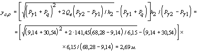 Условный угол плоскости обрушения грунта принимаем: tg e = 3/5,7 = 0,526; e = 27°48¢ » 28°. По табл. 3 прил. 2 (при d = j¢I = 30°; r = 0°; e = 28°) l = 0,33. Эквивалентную распределенную полосовую нагрузку на поверхности засыпки от гусеничной нагрузки НГ-60 определяем по формуле (13) q = 90/(2,5 + ya tgq0) = 90/(2,5 + 1,35 tg 30°) = 27,44 кПа. Расстояние по вертикали от поверхности грунта засыпки до границ распределения условной эквивалентной боковой нагрузки определяем по формуле уа = а/(tg q0 + tg e) = 1,5/(tg 30°+ tg28°) = 1,35 м. Протяжность эпюры давления определяем по формуле уb = (b0 + 2tg q0ух)/(tg e + tg q0) = (3,3 + 2tg30°×1,35)/(tg 28°+ tg30°) = 4,38 м. В соответствии с п. 5.7б принимаем: yb = h - ya = 5,7 - 1,35 = 4,35 м. Интенсивность горизонтального давления грунта на глубине у = 5,7 м, определяем по формуле (1)
