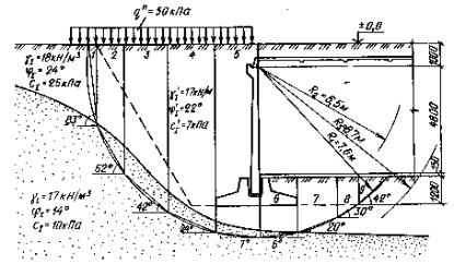 Рис. 19. К расчету общей устойчивости стены подвала против сдвига по круглоцилиндрическим поверхностям Пример 10. Расчет общей устойчивости стены подвала против сдвига по круглоцилиндрическим поверхностямДано. Технический подвал отдельно стоящий. Геометрические и расчетные исходные данные приведены на рис. 19. Строительство осуществляется в районе с сейсмичностью до 6 баллов. Грунтовые воды отсутствуют. Требуется произвести оценку устойчивости стены подвала против сдвига по круглоцилиндрической поверхности. Устойчивость стены подвала вместе с прилегающим к ней грунтом считается обеспеченной, если удовлетворяется условие (102). Значения tgj* и с* для грунтов определяются по формулам (106) и (107). Расчет устойчивости сведен в таблицу. Результаты расчета свидетельствуют об экономичности проектного решения фундамента, так как условие (102), оставаясь больше нуля, близко к нему, а надежность основания обеспечивается учетом в характеристиках грунта коэффициента устойчивости (ki = kn/m = 1,2). Расчеты, произведенные по кривым, проходящим ниже и выше рассмотренной (радиусом R2 = 6,5 м и радиусом R3 = 8,7 м), показали еще большую устойчивость.