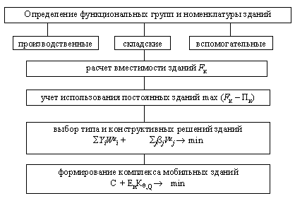 где Fк – общая площадь потребных зданий в tк-й период времени, м2; Пк – площадь используемых постоянных зданий в tк-й период времени, м2. Выбор типа и конструктивных вариантов мобильных зданий из всего их многообразия сводится к нахождению минимального значения