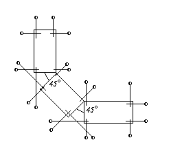Рис. 10. Схема размещения знаков закрепления основных осей при строительстве зданий «башенной» конфигурации Рис. 11. Схема размещения знаков закрепления основных осей при строительстве зданий, примыкающих друг к другу под углом 45°.
