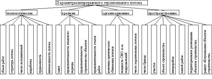 Рис. 15. Классификация параметров непрерывного потока для выполнения программы работ строительной организации 10.6. К пространственным параметрам относятся: участок, объект, микрорайон, жилой район, территориальное размещение объектов, радиус обслуживания объектов строительными подразделениями (район деятельности), а также номенклатура объектов строительства по их конструктивным особенностям (крупнопанельные, кирпичные и др.) и типовым сериям, инженерные сети по видам, по размещению в регионе (город, районный центр, жилой район, микрорайон, квартал, улица, участок застройки, отдельно стоящие здания, расстояния между объектами и от объектов до базы строительной организации). 10.7. К параметрам времени отнесены показатели, характеризующие развитие потока во времени. Для проектирования организации работы непрерывным потоком выделяются следующие параметры: продолжительность строительства объектов и этапов их возведения, величина критического сближения потоков (организационные перерывы), ритм потока, возможные сроки начала строительства (освобождение площадки строительства, инженерная подготовка территории, готовность инженерных сетей и коммуникаций) и директивные (нормативные) сроки ввода объектов в эксплуатацию. При совмещенном выполнении двух смежных технологически зависимых процессов и этапов работ сближение между ними должно быть не менее критического (минимального). Определяется это сближение минимально необходимым опережением предыдущего строительного потока последующим на величину, достаточную для выполнения работ последующего процесса в установленном ритме. Такое опережение принимается в размере объема работ на одной захватке (участке, объекте) предыдущего процесса с учетом возможных отклонений (с заданным уровнем надежности). Критическое сближение может быть выражено в единицах времени, объемах работ на объекте (группе объектов) или в единицах фронта работ определенной строительной готовности. 10.8. Технологические параметры характеризуют особенности производства работ: объем работ, интенсивность потока, выработка, трудоемкость, число исполнителей, структура потока. Деятельность строительно-монтажной организации рассматривается как функционирование системы комплексных (объектных, специализированных) потоков, объединенных общей программой работ и границами региона. Число таких потоков зависит от величины региона, объема работ, количества и организационного уровня специализированных подразделений, входящих в состав строительной организации и привлекаемых со стороны, их мощности. Каждый из комплексных потоков характеризуется структурой, соответствующей характеру выполняемых работ, объектами строительства и условиями его осуществления. Структура определяет состав объектных, специализированных и частных потоков, организуемых для выполнения годовой программы строительного подразделения в соответствии с архитектурными, объемно-планировочными и конструктивными решениями, объемами работ и установившейся специализацией подразделений. Число параллельных потоков определяется в зависимости от объемов работ строительно-монтажной организации и её мощности. 10.9. Для определения параметров надежности строительного производства устанавливается величина отказа для ведущих технологическ