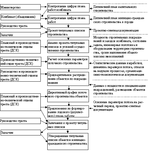 Рис. 16. Порядок разработки предложений по формированию годовой программы работ 10.15. В результате анализа проектов детальной планировки жилых массивов и микрорайонов должны быть определены: участки и градостроительные комплексы, очередность строительства участков (градостроительных комплексов), микрорайонов и их объектов. Уточняются ожидаемые сроки выполнения работ и мероприятий, осуществляемых заказчиком и в зависимости от них – возможные сроки начала строительства. При этом должны быть использованы материалы проектов организации строительства жилых микрорайонов и отдельных объектов. По срокам возможного начала строительства и предлагаемым срокам ввода объектов в эксплуатацию устанавливается период строительства и проверяется его соответствие нормативной продолжительности согласно СНиП 1.04.03-85. Распределяются объекты строительства между организациями в соответствии с их производственной мощностью, специализацией и районом производства работ. 10.16. Строительно-монтажные организации совместно с заказчиком рассматривают предложения (заказы) на работы, выполняемые подрядным способом, составляют протоколы согласования и направляют их вышестоящим организациям. В этих документах объемы строительно-монтажных работ должны быть распределены для каждого строительного подразделения и для каждой стройки, а также по кварталам года с таким расчетом, чтобы был обеспечен ввод объектов в эксплуатацию в нормативные сроки. Прежде всего необходимо предусматривать завершение строительства в установленные сроки ранее начатых объектов. 10.17. Директивный график работ разрабатывается с целью выявления технологической возможности выполнения запланированных объемов работ и ввода объектов в эксплуатацию в предлагаемые сроки; формируется график по объектам и стадиям работ в следующей очередности: распределение объемов строительства при условии равномерной загрузки заводов в течение года и с учетом территориального размещения объектов; распределение объектов строительства по подразделениям строительно-монтажной организации и потокам с учетом принятой специализации, территориального размещения объектов, типов зданий и сроков ввода в эксплуатацию; разработка графика поточного строительства с учетом непрерывной работы специализированных потоков и их увязки между собой и с работой субподрядных организаций, а также с учетом равномерного использования ресурсов. По данным графика устанавливается потребность в материально-технических и финансовых ресурсах по месяцам и кварталам и в целом на планируемый год, проверяется соответствие сроков ввода объектов в эксплуатацию предлагаемым в проекте внутрипостроечных титульных списков, а также своевременность выполнения строительно-монтажных работ, инженерных сетей и инженерного оборудования другими организациями города (района). 10.18. В результате разработки предложений должны быть выявлены расхождения с проектом внутрипостроечных титульных списков по вопросам возможности включения объектов в план работ, объемам работ, срокам ввода в эксплуатацию, финансированию и материально-техническому обеспечению, требованиям к срокам окончания инженерных сетей и коммуникаций, подготовке территории, инженерных сооружений и других работ, выполняемых заказчиком или по его за
