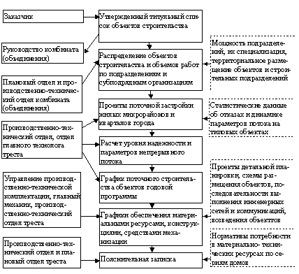 где Тij – продолжительность j-го этапа работ (специализированного потока на объекте на i-м объекте; к – модуль цикличности; m – число захваток; n – число частных потоков (n =1, 2, 3, ...); Sto – организационные перерывы между специализированными потоками, устанавливаемые в зависимости от заданного уровня надежности; кг – коэффициент готовности (надежности)*. __________________ * Инструкция по проектированию организации и управлению поточным жилищно-гражданским строительством на основе непрерывного планирования (РСН 323-83). Киев: НИИСП, 1983. Методические рекомендации по проектированию поточного жилищно-гражданского строительства с учетом надежности Киев: НИИСП, 1983. 10.12. Проектирование работы строительно-монтажной организации непрерывным потоком осуществляется в два этапа. На первом этапе производится разработка предложений по формированию годовой программы строительно-монтажной организации и ее утверждение заказчиком (генподрядчиком), а на втором – разработка документации по организации работы строительных подразделений непрерывным потоком на основе утвержденной годовой программы. 10.13. Предложения по формированию годового плана должны быть направлены на своевременное финансирование всего комплекса работ в течение года, наиболее полное использование мощности промышленной базы, совершенствование поточной технологии и организации производства, рациональное использование материально-технических и трудовых ресурсов, повышение производительности труда, увязку намечаемых объемов работ с производственной мощностью строительно-монтажной организации на обеспечение ввода в действие всех намеченных жилых и гражданских зданий. В предложениях определяются состав (перечень) объектов строительства и сроки их ввода в эксплуатацию по кварталам планируемого года, а также перечень и объем переходящих задельных объектов, необходимых для обеспечения ритмичного ведения работ и эффективного использования ресурсов. В предложениях по формированию годового (двухлетнего) плана работы непрерывным потоком должны содержаться материалы, указанные в табл. 27. Разработка предложений по формированию годовой производственной программы строительно-монтажной организации (рис. 16) включает: анализ полученного от заказчика на согласование проекта внутрипостроечных титульных списков; распределение объектов строительства между строительными подразделениями и субподрядными организациями; составление проекта директивного графика производства работ на основе производственных нормативов; определение потребности в основных материально-технических ресурсах: источники и возможности их покрытия; составление плана финансирования в разрезе годовой программы; подготовка замечаний по структуре плана строительно-монтажной организации и предложений по корректировке проектов внутрипостроечных титульных списков. Методическое руководство и контроль за выполнением работ осуществляет главный инженер (зам. начальника) строительно-монтажной организации.