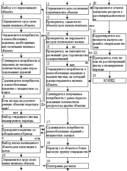 Рис. 18. Укрупненная блок-схема алгоритма разработки годового графика монтажа объектов непрерывным потоком 10.32. Укрупненная блок-схема алгоритма, моделирующего процесс монтажа объектов строительно-монтажной организации, приведена на рис. 18. Блок 1. Выбирается очередной переходящий в стадию монтажа объект, устанавливается его серия и тип, а также бригада монтажников, осуществляющих монтаж объекта. Блок 2. Определяется срок окончания монтажа объекта путем умножения количества оставшихся захваток на продолжительность монтажа одной захватки и деления результата на коэффициент готовности. Определяется срок освобождения бригады. Блок 3. Определяется месячная потребность в железобетонных изделиях, необходимых для окончания монтажа объекта. Блок 4. Суммируется полученная потребность в железобетонных изделиях по месяцам с количеством изделий, израсходованных для ранее рассмотренных переходящих домов. Блок 5. Сравнивается суммарная потребность в железобетонных изделиях в каждом месяце планируемого периода, на который распространяется монтаж переходящего объекта, с мощностью технологических линий заводов. Если потребность в изделиях не превышает возможности заводов, то объект закрепляется за бригадой, включается в поток и управление передается на следующий блок. Блок 6. Проверяется, есть ли еще не рассмотренные переходящие объекты. Если таковые имеются, то повторяется аналогичная работа блоков 1 – 5 для очередного переходящего объекта до тех пор, пока не будут рассмотрены все переходящие объекты. Блок 7. Выбирается очередной месяц планируемого периода. Блок 7 является начальным в основной ветви алгоритма, рассматривающего вновь начинаемые строительством объекты. Блок 8. Проверяется наличие бригад, освобождающихся в рассматриваемом периоде, и среди них выбирается бригада наиболее раннего срока высвобождения. Устанавливаются районы и объекты (серии домов), на возведение которых она специализируется. Блок 9. Выбирается новый объект для данной бригады. Блок 10. Выбранный объект закрепляется за бригадой, определяется срок его монтажа с учетом обеспечения заданного уровня надежности. Блок 11. Определяется дата окончания монтажа подземной части объекта и дата окончания строительства объекта. Блок 12. Проверяется, задан ли по данному объекту ранний срок начала монтажа. Блок 13. Блок 14. Проверяется заданный срок. Блок 15. Определяется потребность в железобетонных изделиях в каждом месяце, на который распространяется монтаж объекта. Блок 16. Суммируется полученная потребность с ранее израсходованным количеством ресурсов на другие объекты. Блок 17. Проверяется, не превышает ли суммарная потребность в изделиях мощности заводов. Если по каждому месяцу заводских ресурсов достаточно, объект окончательно закрепляется за бригадой и включается в поток. На этом рассмотрение данного объекта заканчивается и управление передается на блок 8, в котором проверяется наличие бригад, освобождающихся в рассматриваемом месяце. Если бригада имеется, рассмотренная процедура выбора и включения объекта в поток повторяется. После того, как все бригады, освобождающиеся в данном месяце, будут рассмотрены, управление передается на блок 22. Определяется остаток или дефицит ресурсов строительно-монтажной организации в рассматриваемом месяце, для чего из 