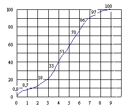 где б) для определения плана освоения капитальных вложений по домам, вводимым в n-м квартале, график нарастания готовности совмещается с календарной сеткой таким образом, чтобы точка абсциссы его, в которой ордината равна 100 %, совпала с `Ткв n-го квартала. Разность ординат графика на границах календарных кварталов показывает, какая доля от стоимости вводимой в n-м квартале площади, должна в них осваиваться; в) произведение стоимости домов, вводимых в n-м квартале, на эти доли дает абсолютные значения плана освоения капитальных вложений в n-м, (n – 1)-м и т.д. кварталах, обеспечивающего сдачу в n-м квартале заданной площади с заданными ритмом и `Тм. Сумма таких планов показывает размеры капитальных вложений по данной серии домов в целом. Пример расчета. Определить размеры капитальных вложений по календарным кварталам 1987 – 1989 гг. на возведение девятиэтажных крупнопанельных домов. Исходные данные 1) Годовые размеры ввода полезной площади с разбивкой по месяцам показаны в табл. 31. 2) Среднемесячные сроки ввода приняты для 1987 – 1988 гг. – середина (0,83 мес.) III декады, для 1989 г. – конец II декады (0,67 мес.), для 1990 г. – середина месяца (0,5 мес.). 3) Полная сметная стоимость 1 м2 полезной площади составляет 135,76 руб. 4) Средняя продолжительность возведения домов составляет 9 месяцев. 5) График нарастания готовности домов показан на рис. 20. Порядок расчета рассмотрим на примере домов, вводимых в IV квартале 1987 г. Среднеквартальный срок ввода этих домов составляет `Т кв = 0,83 + (8 + 2 ´ 12,5)/26,5 = 2,1 мес.