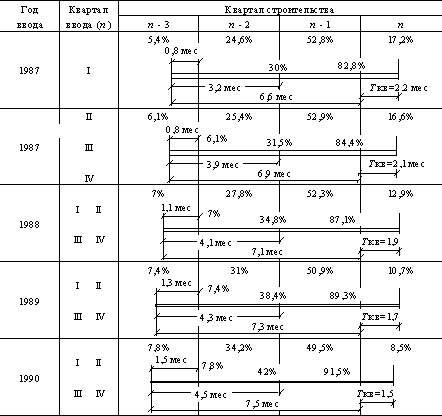 где Sn – размеры капитальных вложений для возведения в n-м году домов k-й серии; `s – средняя стоимость 1 м2 полезной площади домов k-й cерии; Vn, Vn+1 – размеры ввода домов k-й серии в n-м, (n+1)-м году; Кn, Kn+1 – норма задела для дома k-й серии на n-й, (n+1)-й год. Для уточненных расчетов, выявляющих динамику капитальных вложений, и объемов строительно-монтажных работ по календарным кварталам, используется приводимая ниже методика. Исходными данными для расчета являются годовые размеры ввода полезной площади с разбивкой по месяцам: среднемесячные для каждого года сроки ввода `Тм; стоимость 1 м2 полезной площади; средняя продолжительность возведения домов рассматриваемой серии; график нарастания готовности домов рассматриваемой серии во времени. График нарастания готовности (ордината – процент от стоимости, абсцисса – время от начала строительства) характеризует во времени динамику освоения капитальных вложений в процессе возведения домов и отражает в стоимостных показателях технологию работ. Продолжительность и, соответственно, график нарастания готовности могут изменяться по годам рассматриваемого периода в зависимости от планируемых мероприятий по совершенствованию организации и технологии возведения домов данной серии. Существо методики расчета состоит в том, что графики возведения совокупности домов, сдаваемых в одном календарном квартале, заменяются графиком возведения одного дома-представителя, срок ввода которого соответствует среднеквартальному сроку ввода `Ткв заменяемых домов. Площадь и стоимость такого дома-представителя равны общим размерам и стоимости площади, вводимой в рассматриваемом квартале. В результате расчета выявляется, как распределяются по календарным кварталам капитальные вложения, которые должны осваиваться при возведении групп домов, сдаваемых в одном квартале. Порядок расчета следующий: а) определяются среднеквартальные сроки ввода по формуле