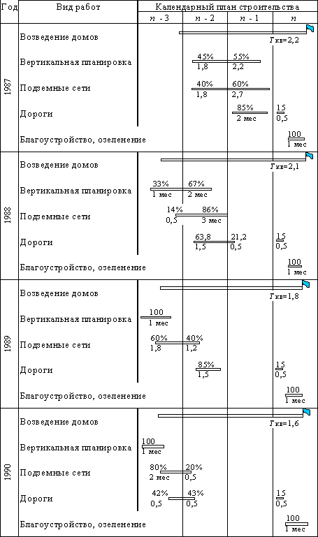 Это позволяет учесть динамику совмещения работ при переходе к опережающей инженерной подготовке. Исходными данными для расчета являются: годовые размеры ввода полезной площади по всей совокупности строящихся серий с разбивкой по календарным кварталам; среднеквартальные сроки ввода полезной площади `Ткв; средневзвешенная продолжительность возведения жилых домов; средние продолжительности выполнения видов работ по инженерной подготовке и совмещение их с периодом возведения домов; удельные показатели стоимостных затрат на 1 м2 полезной площади по видам работ инженерной подготовки. Продолжительность выполнения видов работ и степень совмещения их с периодом возведения домов определяются на основе анализа актов о выполненных работах, натурных наблюдений, а также экспертным путем. Удельные показатели затрат на 1 м2 полезной площади по видам работ определяются по проектно-сметной документации. Учитывая, что затраты эти в различных районах неоднозначны и зависят от целого ряда факторов, при определении их средневзвешенных величин следует проанализировать достаточно представительное количество микрорайонов с общей площадью домов в размере, не меньшем годового ввода. Для определения капитальных вложений по кварталам график совмещения работ накладывается на календарную сетку таким образом, чтобы срок окончания возведения дома совпал с`Ткв. Объемы работ по каждому из видов распределяются по календарным кварталам пропорционально распределению продолжительности их выполнения, т.е.