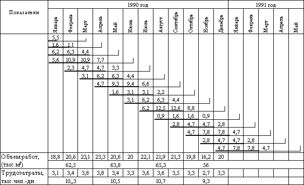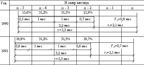 В соответствии с этим объем монтажных работ равен 35 + 15 + 20 + 30 + 10 + 20 + 40 + 5 + +15 + 0,5(25 + 15 + 20 + 25 + 15 + 25) = 247,5 тыс. м2. Исходя из этого, трудозатраты на монтажных работах в 1990 г. составляют 0,165 ´ 247,5=40,8 тыс. чел.-дн. Для уточненных расчетов строится календарный график выполнения работ. На рис. 22 показано относительное распределение объемов работ по месяцам 1990 г. и 1991 г. в соответствии с технологическим графиком возведения домов и принятыми `Тм. Относительный объем работ, выполняемый в каждом месяце, определяется следующим образом: в 1990 г. в (n – 5)-м месяце монтаж должен осуществляться 0,5 мес. Доля от общего объема монтажа по домам, сдаваемым в n-м месяце, составит в (n – 5)-м месяце (0,5 ´ 100 %)/3,2 = 15,6 %.