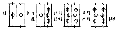угол поворота φ0 = 711,29×5×10-5 = 0,035565 рад. Дальнейшие вычисления в гр. 8 и 9 выполнены по формулам (8) - (10). Приращения прогибов и прогибы (гр. 10 и 11) вычислены по формулам (22) и (23). Проверка прочности и местной устойчивости стойки приведена в примере 9. РАСЧЕТ ПОЯСОВ В ПАНЕЛЯХ СО СТЫКАМИ4.29. В панелях со стыками необходимо проверить: устойчивость пояса при сжатии; прочность пояса при сжатии; прочность стыковых накладок (если стык выполняется на накладках). Сжатый пояс из одиночного уголка с телескопическим стыком или со стыком, осуществляемым на уголковых накладках, следует рассчитывать как внецентренно сжатый элемент по формуле (51) [1]: где φe - коэффициент, определяемый по табл. 74 [1] в зависимости от условной гибкости Площадь поперечного сечения пояса брутто A, усилие N, гибкость λ и относительный эксцентриситет m следует определять в зависимости от типа стыка в соответствии с рекомендациями пп. 4.30 - 4.32. 4.30. При решетке с совмещенными в смежных гранях узлами и стыке в пределах панели (телескопическом или с уголковой накладкой) расчет пояса следует выполнять в соответствии с расчетной схемой (черт. 11). Распределение моментов от внецентренного сжатия между уголками, примыкающими к стыку, допускается принимать как в трехпролетной неразрезной балке. По формуле (26) необходимо проверить каждый из примыкающих к стыку уголков на расчетное усилие в панели N. Относительные эксцентриситеты должны определяться по формулам: m = m1 = e0kA(1)x1/I(1)min; (27) m = m2 = e0(1 - k)A(2)x2/I(2)min. (28) Черт. 11. Расчетная схема панели пояса со стыком при решетке с совмещенными в смежных гранях узлами 1, 2 - уголки e0 - расстояние между центрами тяжести стыкуемых уголков (черт. 12, где для примера показан телескопический стык); k - доля момента от эксцентриситета нормальной силы в стыке, воспринимаемая уголком 1 (см. черт. 11); A(1), A(2) - площади сечений брутто уголков 1 и 2; x1, x2 - расстояния от осей y01-y01 и y02-y02 до наиболее сжатого волокна уголков 1 и 2; I(1)min, I(2)min - соответствующие минимальные моменты инерции. Если стыкуемые уголки различного сечения, то индексом 1 отмечается уголок большего сечения. Черт. 12. Сечение телескопического стыка 1, 2 - поясные уголки; 3, 4 - центры тяжести уголков Коэффициент k следует определять по формуле