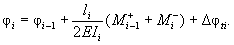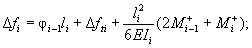 где li - длина i-го участка, расположенного между узлами i - 1 и i; Qri, Nri - поперечная и нормальная силы на i-м участке, определенные по недеформированной схеме; Ii - момент инерции i-го участка; Δfti - приращение стрелки начального искривления стойки на i-м участке; Δφti - приращение угла поворота начального искривления на i-м участке;
