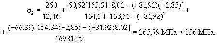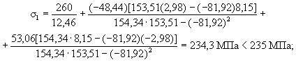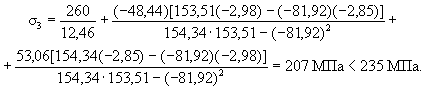 Точка 3. Нормальные напряжения σ3 определяются по формуле (49) при My = 0 и y = bsin 36° = 0,362×0,5878 = 0,213: σ3 = 53,90/(1,882×10-2) + 711,29×0,213/(1,276×10-3) = 1,474×105 кН/м2 = 147,4 МПа < 235 МПа. Касательные напряжения τ3 определяются по формуле (53) при Qx = 0, коэффициент ky3 - из третьей строки табл. 12. τ3 = 0,851×33,54(0,362)2/(1,276×10-3) = 2931 кН/м2 = 2,931 МПа. Проверим прочность по формуле (54): 2,931 МПа < 135 МПа;