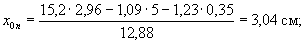 Моменты инерции сечения нетто: Ixn = 176 + 15,2(2,89 - 2,96)2 - 1,09(2,89 - 0,35)2 - 1,23(6 - 2,89)2 = 157,13 см4; Iyn = 176 + 15,2(3,04 - 2,96)2 - 1,09(5 - 3,04)2 - 1,23(3,04 - 0,35)2 = 163 см4. Координаты центра тяжести сечения нетто поясного уголка относительно осей x2 и y2: a = 2,89 - 0,35 = 2,54 см; b = 3,04 - 0,35 = 2,69 см. Центробежный момент инерции: Ixn,yn = -2,54×2,69×12,88 = -88 см4. Эксцентриситеты приложения сил Nmd1 и Nmd2 относительно осей xn и yn: ex1 = -2,54 см; ey1 = 5 - 3,04 = 1,96 см; ex2 = 6 - 2,89 = 3,11 см; ey2 = 2,69 см. Изгибающие моменты: Mxn = 0,444[30(-2,54) + (-10)3,11] = -47,64 кН×см; Myn = 0,444[30×1,96 + (-10)(-2,69)] = 38,05 кН×см. Координаты точки 1 в осях xn и yn: x1 = 11 - 3,04 = 7,96 см; y1 = - 2,89 см. Напряжение в точке 1 по формуле (1):