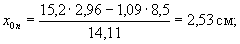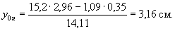 Моменты инерции: Ixn = 176 + 15,2(3,16 - 2,96)2 - 1,09(3,16 - 0,35)2 = 168 см4; Iyn = 176 + 15,2(2,96 - 2,53)2 - 1,09(8,5 - 2,53)2 = 140 см4. Координаты центра тяжести сечения нетто относительно осей x2 и y2: a = 3,16 - 0,35 = 2,81 см; b = 2,53 - 0,35 = 2,18 см. Ixn,yn = -2,81×2,18×14,11 = -86,44 см4. Значения изгибающих моментов в сечении 2-2 те же, что и в сечении 1-1: Mxn = -47,64 кН×см; Myn = 38,05 кН×см. Координаты точки 1 в осях xn и yn: x1 = 11 - 2,53 = 8,47 см; y1 = -3,16 см. Напряжение в точке 1 по формуле (1):