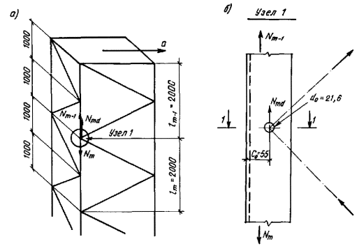 Так как площадь сечения An по «зигзагу» больше, чем по сечению 1-1, проверка по сечению 1-1 не требуется. Аналогично проверяются сжатые пояса и другие элементы. Пример 3 (к п. 4.20). Расчет на прочность пояса по формуле (4) Проверим на прочность растянутый поясной уголок 110 ´ 7 в узле 1 по сечению 1-1 (черт. 10). Уголок из стали марки ВСт3сп5 по ГОСТ 380-71. Черт. 10. К примеру расчета 3 а - схема отсека опоры; б - схема усилий в узле 1 Сечение пояса постоянно по длине. Усилия в панели ниже узла 1: Nm = 250 кН; Nmd = 50 кН. Характеристики сечения поясного уголка: A = 15,2 см2; d0 = 2,16 см; An = 15,2 - 2,16×0,7 = 13,69 см2. Расстояние по полке от обушка до центра отверстия c0 = 5,5 см;