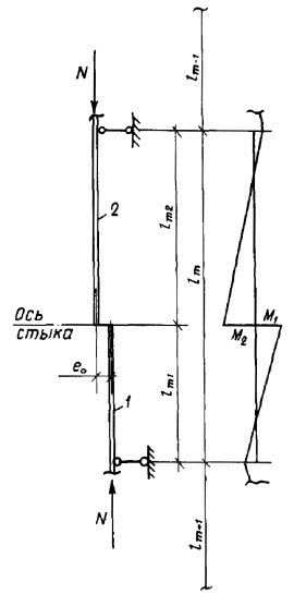 Здесь коэффициенты kb и ka определяются по формулам (29) и (30), в которых следует: минимальные моменты инерции уголков I(1)min, I(2)min заменить моментами инерции I(1)x, I(2)x относительно осей, параллельных полкам; длины элементов lm, lm-1, lm+1, lm1, lm2 принять равными l(B)m, l(B)m-1, l(B)m+1, l(B)m1, l(B)m2 или l(А)m, l(А)m-1, l(А)m+1, l(А)m1, l(А)m2 при расчете коэффициентов kb и ka соответственно. Гибкость уголков определяется по формуле (31), в которой i = ix. При проверке устойчивости в плоскости грани В расчетная длина определяется по формуле lef = μl(B)m, в которой коэффициент расчетной длины μ уголка 1 равен: μ = 1,14μ1, (39) где μ1 - следует определять по графикам черт. 13 в зависимости от отношений I(2)x/I(1)x и l(B)m2/l(B)m. Черт. 14. Расчетная схема панелей пояса со стыком при решетке со смещенными в смежных гранях узлами 1, 2 - уголки Для уголка 2 коэффициент расчетной длины μ равен: μ = μ2 = 1,14μ1 Площадь сечения A в формуле (26) принимается равной A(1) или A(2) соответственно для уголков 1 и 2. Аналогично следует выполнять расчет в плоскости грани A. Если стык выполняется на уголковой накладке, прочность ее должна проверяться по формуле (33), в которой усилие в накладке равно усилию в полупанели, содержащей стык, а изгибающий момент вычисляется по формуле (34), где k определяется по формуле (38). Проверка прочности стыкуемых уголков должна выполняться по формулам (35) - (37). 4.32. При расположении стыка пояса в узле решетки с совмещенными в смежных гранях узлами (черт. 15) следует рассчитывать каждую из примыкающих к стыку панелей пояса как внецентренно сжатый элемент по формуле (26) соответственно на усилия N1 и N2. Распределение моментов от внецентренного сжатия между уголками, примыкающими к стыку, можно принимать как в двухпролетной неразрезной балке. Черт. 15. Расчетная схема панелей пояса при стыке в узле решетки с совмещенными в смежных гранях узлами 1, 2 - уголки Относительные эксцентриситеты усилий в панелях определяются по формулам: k(1) = I(1)min/l1, k(2) = I(2)min/l2; (43) l1, l2 - геометрическая длина панелей, примыкающих к стыку. Остальные обозначения - см. п. 4.30. Гибкость каждого из уголков определяется по формуле (31), в которой i = imin, а расчетная длина lef равна геометрической. Расчет уголковой накладки необходимо выполнять на большее из усилий в стыкуемых уголках в соответствии с рекомендациями п. 4.30. Прочность примыкающих к стыку уголков проверяется по формулам (35) - (37). При этом в формуле (35) следует принять N = N1, в формуле (36) - N = N2, в выражениях (37) значение k определяется по формуле Примеры расчета Пример 6 (к пп. 4.29 и 4.30). Расчет панели пояса с телескопическим стыком при решетке с совмещенными в смежных гранях узлами. Стык сварной. Расчетное усилие в панели N = 160 кН. Длина панели пояса lm = 120 см; длина большего из стыкуемых уголков lm1 = 90 см, длина меньшего из стыкуемых уголков lm2 = 30 см; длины примыкающих панелей: lm-1 = lm+1 = 120 см. Стыкуемые уголки: Ð 90 ´ 8 и Ð 80 ´ 8. Материал - сталь марки ВСт3пс6 по ГОСТ 380-71, Ry = 235 МПа. Характеристики уголков: Ð 90 ´ 8: A(1) = 13,9 см2; I(1)min = 43,8 см4; i(1)min = 1,77 см; z(1)0 = 2,51 см; Ð 80 ´ 8: A(2) = 12,3 см2; I(2)min = 30,3 см2; i(2)min = 1,57 см; z(2)0 = 2,27 см. Расстояние между центрами тяжести стыкуемых уголков e0 = (d(1) + z(2)0 - z(1)0)1,41 = (0,8 + 2,27 - 2,51)1,41 = 0,79 см. Расстояния от оси y0-y0 до наиболее сжатого волокна: уголок 1 - сжато перо: x1 = b(1)×0,707 - z(1)0×1,41 = 9×0,707 - 2,51×1,41 = 2,82 см; уголок 2 - сжат обушок: x2 = z(2)0×1,41 = 2,27×1,41 = 3,20 см. Коэффициент расчетной длины μ1 = 1,01 для большего из стыкуемых уголков определен по гра