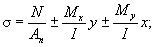 Эксцентриситеты приложения силы Nmd1: ex1 = -(y0n - δ/2) = -(2,98 - 0,35) = -2,63 см; ey1 = (c01 - x0n) = (6 - 2,85) = 3,15 см. Эксцентриситеты приложения силы Nmd2: ex2 = (c02 - y0n) = (6 - 2,98) = 3,02 см; ey2 = -(x0n - δ/2) = -(2,85 - 0,35) = -2,5 см. Подставляя значения Nmd1, Nmd2, k, ex1, ey1, ex2, ey2 в формулу (2), получим: Mxn = 0,444[30(-2,63) + (-10)3,02] = -48,44 кН×см; Myn = 0,444[30×3,15 + (-10)(-2,5)] = 53,06 кН×см. Координаты точек 1-3 сечения поясного уголка в осях xn и yn: x1 = 11 - 2,85 = 8,15 см; y1 = -2,98 см; x2 = -2,85 см; y2 = 11 - 2,98 = 8,02 см; x3 = -2,85 см; y3 = -2,98 см. Напряжения в точках 1-3 сечения 1-1 определим по формуле (1):