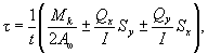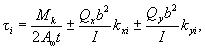 где Sx, Sy - статические моменты частей сечения, лежащих между точками С - yk и C - xk. Знаки в формуле (50) следует принимать в соответствии с направлением касательных напряжений от сил Qx и Qy, показанным на черт. 16,б (напряжения, направленные одинаково, в точке С принимаются с одинаковыми знаками). В характерных точках сечения, показанных для различного числа граней на черт. 16,в, касательные напряжения определяются по формуле