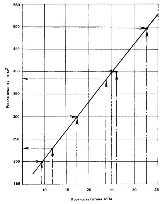 3. Строят график зависимости прочности бетона от расхода цемента (рисунок). Пример 22. Для бетона со средним уровнем прочности Rу = 23,5 МПа нужно найти расход цемента, обеспечивающий этот уровень. На рисунке из точки, соответствующей прочности 23,5 МПа, проводим вертикаль до пересечения с прямой и полученную точку сносим на ось расхода цемента, где находим расход Ц = 363 кг/м3. Пример 23. В условиях примера 20 необходимо уменьшить средний уровень прочности бетона Rу = 13,1 МПа до 12,2 МПа. Расход цемента при Rу = 13,1 МПа составлял Ц = 255 кг/м3. Для повышения точности расчет коррекции расхода цемента будем вести по приращениям. Зависимость расхода цемента от прочности бетона. По рисунку прочностям 13,1 и 12,2 МПа соответствуют расходы цемента 250 и 230 кг/м3. Коррекция расхода цемента DЦ = 230 - 250 = -20 кг/м3. Тогда расход цемента, необходимый для получения нового среднего уровня прочности бетона Ry = 12,2 МПа, составит Ц¢ = Ц + DЦ = 255 - 20 = 235 кг/м3. ПРИЛОЖЕНИЕ 1ОРГАНИЗАЦИЯ ПОДГОТОВИТЕЛЬНОГО ПЕРИОДА И ОСОБЕННОСТИ КОНТРОЛЯ ПРОЧНОСТИ БЕТОНА НЕРАЗРУШАЮЩИМИ МЕТОДАМИ1. Основные принципы статистического контроля прочности бетона как при определении ее по испытанию образцов, так и неразрушающими методами, совпадают. Однако в период перехода на статистический контроль неразрушающими методами есть специфические особенности, обусловленные тем, что прочность определяется косвенным методом, связанным с использованием градуировочных зависимостей, устанавливаемых на основании параллельного испытания контрольных образцов неразрушающими методами и на прессе. Среднюю прочность в конструкции используют при контроле сборных плоских и многопустотных плит перекрытий и покрытий, дорожных плит, панелей внутренних несущих стен, стеновых блоков, напорных и безнапорных труб, так как несущие свойства этих конструкций определяются средней прочностью бетона расчетных сечений, которая принимается в данном случае равной средней прочности бетона конструкции. Для всех остальных сборных конструкций, а также для монолитных и сборно-монолитных конструкций используют прочность отдельных участков конструкций площадью от 100 до 400 см2, определяемую по соответствующему стандарту на неразрушающий метод определения прочности. Например, при ультразвуковом контроле на участке может производиться только одно измерение, а при контроле молотком Кашкарова - пять измерений, среднее значение которых и принимается в качестве единичного результата аналогичного среднему в серии контрольных образцов. 3. Для контролируемых конструкций в подготовительный период проводят построение градуировочных зависимостей по правилам, изложенным в действующих стандартах на методы неразрушающего контроля, и вычисляют остаточное среднеквадратическое отклонение градуировочной зависимости Sт. 4. Для конструкций, при контроле которых по п. 2 настоящего приложения за единичное значение принимают прочность отдельных участков, вычисляют коэффициент Kп по формуле Kп = Vо/Vнм (1) где Vо - коэффициент вариации прочности бетона по результатам испытания контрольных образцов нагружением (на прессе), рассчитанный по всем сериям образцов, испытанных при построении градуировочной зависимости; Vнм - коэффициент вариации прочности бетона по результатам испытания тех же серий образцов неразрушающим методом. Коэффициенты вариации 