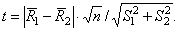 6. Если дисперсии однородны, то производят сравнение средних прочностей по зонам изделий, для чего вычисляют фактическое значение t-критерия по формуле 7. При неоднородных дисперсиях (F > Fт) значение t-критерия берут по табл. 1 в зависимости от условного пусл, определяемого по формуле