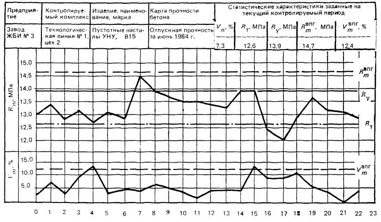 где п - количество проб, отбираемых от партии бетона. 8.10. При нормальном ходе технологического процесса точки на графиках прочности в партии и коэффициента вариации в партии располагаются примерно равномерно относительно соответствующих линий средних: среднего уровня прочности Rу и принятого среднего по партиям коэффициента вариации Vп. При этом точки не должны выходить за линии верхних предупредительных границ. На практике возможен ряд отклонений, вызываемых нарушением технологического процесса. 8.11. В случае когда в интервал между линиями Ry и Rт попадают подряд три и более точки, следует откорректировать состав бетона с целью повышения его прочности и одновременно принять меры к выявлению и устранению причин, вызвавших падение прочности. В дальнейшем при устойчивом превышении прочности в партии над средним уровнем Ry возможно возвращение к старому составу бетона. 8.12. Если очередная партия бетона бракуется (Rm < Rт), то следует подсчитать количество принятых перед этим подряд партий. Если из последних 10 партий хотя бы еще одна была забракована, то следует немедленно принять меры для повышения прочности бетона (откорректировать состав и др.). Если же перед этим 9 или более партий подряд были приняты, то вмешательство в технологический процесс нецелесообразно. 8.13. Если в четырех партиях подряд коэффициент вариации выше линии среднего партионного коэффициента вариации Vп, а в пятой партии он выше верхней предупредительной границы, то следует найти причины роста колебаний прочности бетона. Аналогичные меры принимаются, если три точки или более из последних десяти лежат выше линии Vmвпг. Пример 20. На заводе ЖБИ № 8 в цехе № 2 на технологической линии № 1 из бетона класса В15 выпускают пустотные настилы УНУ. Нормируемая отпускная прочность по проекту 70 % класса. Цех работает в три смены. В качестве партии принят суточный выпуск бетона для настилов УНУ. Каждую смену отбирают по одной пробе для контроля отпускной прочности бетона. По данным контроля прочности бетона за май месяц партионный коэффициент вариации Vm = 9,5 %. Требуется построить контрольную карту прочности бетона на июнь. Пример заполнения контрольной карты показан в прил. 4. Анализируя контрольную карту, можно сделать следующие выводы. 1. В партиях № 52…56 (5 партий подряд) и № 64…66 (три партии подряд) фактическая прочность выше среднего уровня. Кроме того, в партиях № 52, 53 и 59 фактическая прочность выше верхней предупредительной границы. В результате средняя за контролируемый месяц прочность бетона Rк = 13,1 МПа выше заданного среднего уровня Rу = 12,9 МПа. Поэтому следует принять меры к снижению прочности бетона и сокращению расхода цемента. 2. Коэффициент вариации прочности бетона в отдельных партиях в первые три недели месяца колебался примерно симметрично относительно заданного среднего партионного значения Vп = 9,5 %„ не выходя за верхнюю предупредительную границу Kmвпг = 16,2 %. В последнюю неделю на графике видна тенденция к падению коэффициента вариации, что привело к снижению среднего за месяц, коэффициента вариации на 1,6 % по сравнению с предыдущим месяцем. В результате средний уровень прочности на июль будет снижен на 0,7 МПа. Если бы лаборатория вовремя среагировала на завышение прочности бетона, рассмотренное в предыдущем пункте, то снизить расход цемента можно было бы на д