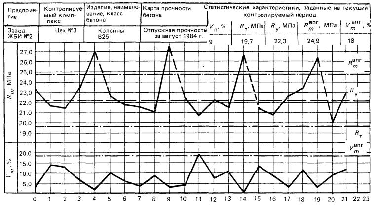 14. По формуле (13) ГОСТ 18105-86 определяется коэффициент Kв, характеризующий допустимое превышение фактической средней прочности бетона в проектном возрасте за контролируемый период Rкп.в над требуемой Rтп.в; Rкп.в = (33,1 +33,1 + 32 + 32,7)/4 = 32,7 МПа; Kв = Rкп.в/(Rтп.вKмп) = 32,7/(27,2×1,07) = 1,12. По прил. 4 ГОСТ 18105-86 для условий рассматриваемого примера коэффициент Kв = 1,2 > 1,12. Поэтому превышение фактической средней прочности бетона в проектном возрасте за контролируемый период над требуемой допустимо; 15. Контролируемый период принимается за анализируемый. Выполняется процедура, аналогичная описанной в пп. 8, 9. В результате определяется среднее значение партионного коэффициента вариации за анализируемый период Vп и значение требуемой прочности Rт на очередной контролируемый период. Результаты вычислений представлены в табл. 6. Коэффициент d = 1,13; Wm определяется как разность между большим и меньшим единичными значениями прочности бетона в партии. По данным табл. 6 определяется Vп = 8,3 %, а по табл. 2 ГОСТ 18105-86 Kт = 1,09. Требуемая отпускная прочность Rто.п = 1,09×17,5 = 19,1 МПа. Определяется требуемая прочность бетона в проектном возрасте Rтп.в. Для этого находится Vпп.в = 0,85×8,3 = 7,1 %; Kтп.в = 1,08 и затем Rтп.в = 1,08×25 = 27 МПа. Определяется средний уровень отпускной прочности Rу. Для этого находится Kмп = 1,07 и затем Rу = 19,1×1,07 = 20,4 МПа. 16. Очередной контролируемый период устанавливается продолжительностью один месяц. В этот период используются определенные в п. 15 значения Rто.п, Rтп.в, Ry. Процесс контроля аналогичен описанному в пп. 10 - 15. Затем этот период принимается за анализируемый и т.д. Приложение 4Контрольная карта отпускной прочности сборных железобетонных конструкций