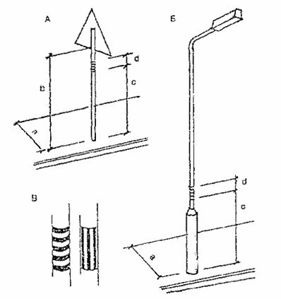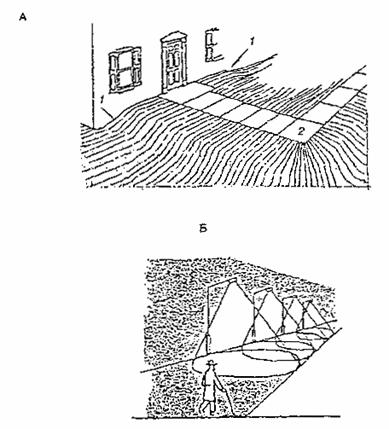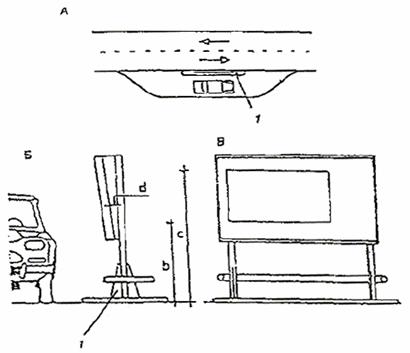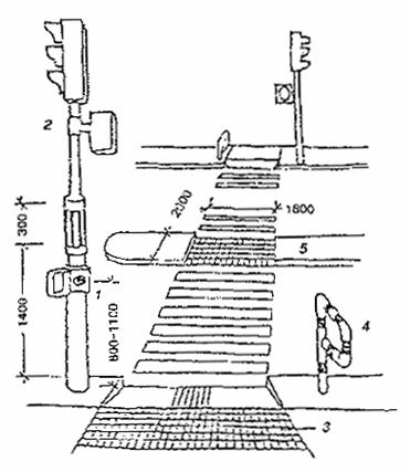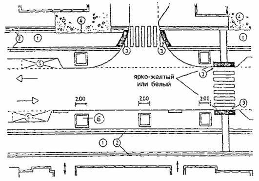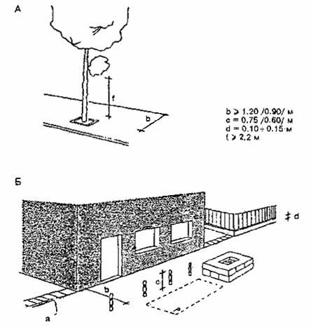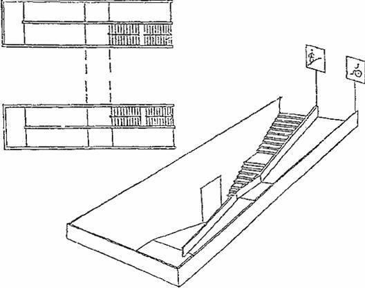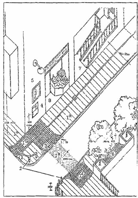 Рис. 16. Расположение информационного стенда на стоянке автотранспорта и параметры стенда А - схема размещения стенда; Б, В - фасады стенда; 1 - информационный стенд. Параметры указателя, удобные как для инвалида в кресле-коляске, так и для родителя легкового автомобиля: b 0,9 м; с = 1,7 м; d = 10:1 МАРКИРОВКА ПРЕПЯТСТВИЙ 4.7. Следует по возможности убирать препятствия на пути слабовидящих. Если это невозможно, следует маркировать их, применяя яркие и контрастные цвета, на уровне глаз (рис. 17). Оптимальными для маркировки считаются цвета ярко-желтый, ярко-оранжевый и ярко-красный. Рекомендуется применять контрастные сочетания - белый с черным и белый с красным в виде горизонтальных, вертикальных и диагональных полос. Наиболее распространены обозначения: белый - основное направление пути, черный и желтый - обозначение препятствий (ступени, столбы, указательные знаки), оранжевым маркируются перила. Следует применять прочные красители, не изменяющиеся от погодных условий. Рис. 17. Маркировка столбов и указательных знаков А - маркировка указательных знаков; Б - маркировка столбов освещения; В - примеры контрастной вертикальной и горизонтальной маркировки столбов; а - минимальное расстояние до препятствий (от бордюрного камня, фасада здания и т.п.), а = 1,20 (0,90) м; b - расстояние до низа информационных знаков, b = 2,20 м; с - расстояние до низа маркировки на столбе, с = 1,50 м; d - размер маркировки на столбе, d = 0,30 м УСТРОЙСТВА ДЛЯ СЛОЖНЫХ ГРАДОСТРОИТЕЛЬНЫХ УСЛОВИЙ 4.8. В исключительно стесненных условиях, при наличии надземных пешеходных переходов допускается устройство винтовых пандусов. Винтовые пешеходные подъемы (спуски) занимают меньшую площадь, чем прямые пешеходные переходы в разных уровнях, примерно в 1,5 раза. Недостатки подобного решения - затрудненное передвижение инвалидов на креслах-колясках по кривой траектории с уклоном и необходимость устройства навесов-перекрытий. Расчет габаритов винтовых пандусов следует производить по графику 2 ВСН 62-91*. 4.9. В исторически сложившихся городских комплексах при невозможности устройства пандусов с допустимыми уклонами рекомендуется применять подъемники, лифты, выжимные платформы (рис. 18). Рис. 18. Примеры подъемников для самостоятельного использования инвалидами А - крытый подъемник для инвалидов на наружной лестнице; Б - выжимная платформа для одного человека КОМПЛЕКС ПЛАНИРОВОЧНЫХ МЕРОПРИЯТИЙ 4.10. В качестве «естественных» направляющих линий, т.е. имеющихся, а не создаваемых специально для инвалидов элементов улицы, удобных для ориентации людей с дефектами зрения, пользующихся тростью, следует использовать: фасады зданий, параллельных тротуару и примыкающих к нему непосредственно; бордюрные камни газонов; заборы, другие ограждения и т.п. (рис. 19). 4.11. Обязательно устройство дополнительных направляющих линий и информационного обеспечения в тех местах, где повышена вероятность возникновения опасных ситуаций, - у наземных переходов, у поворотов улицы и т.п. Рис. 19. Комплекс мероприятий по созданию безбарьерной среды на жилой или торговой улице (в комплекс входят устройства для людей с дефектами зрения, пользующихся тростью) 1 - безбарьерные пешеходные пространства; 2 - направляющие линии, контрастные к окружающей среде по цвету и фактуре; 3 - маркированные края тротуара; 4 - «естественные» направляющие линии; 5 - авт