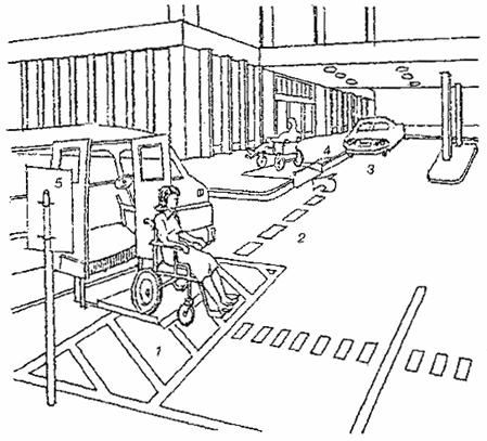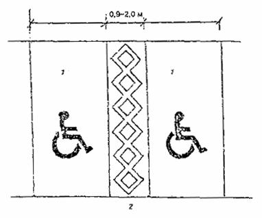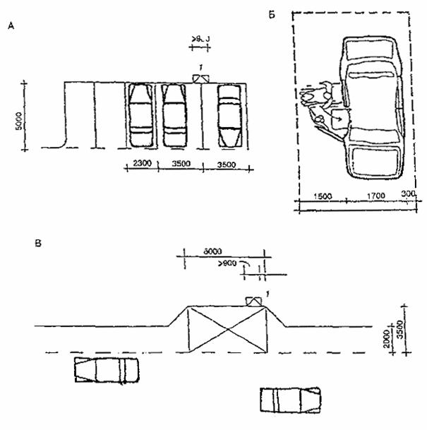 Рис. 11. Обозначение мест паркования автомобилей, управляемых водителями-инвалидами 1 - место для автомобиля; 2 - общая для двух автомашин дорожка движения кресла-коляски 3.8. С целью экономии территории в затесненных городских условиях рекомендуется на стоянках делать двойную разметку: три места для обычных автомобилей соответствуют двум местам для автомобилей инвалидов. Такая разметка целесообразна возле зданий, посещаемых инвалидами в определенные часы (поликлиники, учебные заведения), в остальное время стоянки могут быть использованы другими группами населения. Время преимущественного использования стоянок инвалидами должно быть указано на хорошо различимых информационных стендах. · Для автомашин инвалидов следует резервировать места, примыкающие к выходам со стоянок либо максимально приближенные к входам в здания. 3.9. Для удобства въезда на стоянку, возможна разметка мест для личного автотранспорта под углом к проезжей части улицы (рис. 12). Если стоянка платная с применением автоматов, то кнопка включения оплаты должна находиться на высоте 0,8 - 1,1 м от земли. 3.10. В центральных, исторически ценных районах городов с памятниками культуры и архитектуры при размещении стоянок для автомашин инвалидов следует (соблюдая нормативные расстояния от стоянок до входов в здания) следить за тем, чтобы принятое решение не вступало в противоречие со сложившимся обликом района. Для этого следует создавать небольшие по емкости автостоянки, возможно - подземные. 3.11. В условиях малоэтажной застройки рекомендуется устройство встроенных гаражей, в том числе под жилыми домами, или их размещение на приусадебных участках. Рис. 12. Пример разметки мест стоянки под углом к проезжей части а = 3,5 м; b = 1,5 м; 1 - пандусы схода на стоянку с тротуара; 2 - информационные столбики и автоматы оплаты стоянки ОСТАНОВКИ ОБЩЕСТВЕННОГО ТРАНСПОРТА 3.12. Для обеспечения возможности использования внешнего (междугородного) транспорта людьми с нарушениями опорно-двигательного аппарата, дефектами зрения и слуха все остановочные пункты внешнего транспорта должны быть оборудованы приспособлениями для входа инвалидов в транспортные средства и для получения необходимой информации. 3.13. Площадки для остановки специализированных транспортных средств, перевозящих инвалидов, следует предусматривать на расстоянии не более 100 м от входов в общественные здания общего пользования и в неспециализированные производственные предприятия. Расстояние от остановки специализированного (неличного) транспорта до специальных, в том числе лечебных учреждений определяется заданием на проектирование данного учреждения. В отдельных случаях (например, остановки «перевозок» у больниц) транспортные средства, должны останавливаться вплотную к входам. 3.14. Остановки всех видов городского общественного транспорта, стоянки такси должны обеспечивать возможность посадки и высадки пассажиров, пользующихся креслами-колясками (рис. 13). Остановки должны быть оборудованы хорошо читаемой информацией о транспортных маршрутах, возможных препятствиях, в том числе информацией для слепых по азбуке Брайля. Рис. 13. Примеры оборудования автобусных остановок А - остановка специального автобуса, местное повышение тротуара; Б - разрез крытой части автобусной (троллейбусной) остановки; В - план зоны ожи