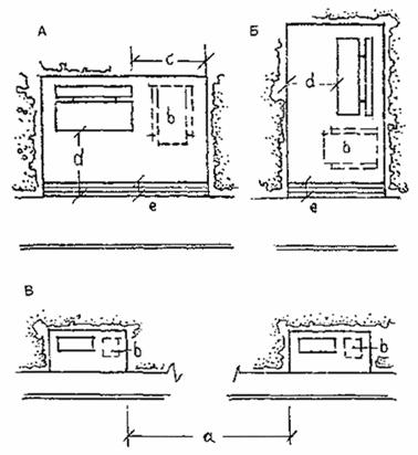 Рис. 14. Гараж-стоянка (рекомендуемые размеры: 6,0 - 6,5 ´ 3,5 - 3,9 м) А - устройство навеса над стоянкой для автомашины инвалида на кресле-коляске; Б - план гаража, предназначенного для автомашины инвалида на кресле-коляске (размеры в см) 4. Элементы городской среды, благоустройство, информацияПЛОЩАДКИ ДЛЯ ОТДЫХА 4.1. В торговых центрах, на торговых (пешеходных) улицах, возле остановок общественного транспорта, на пешеходных дорожках и прогулочных маршрутах в парках, а также в зонах отдыха жилых массивов должны предусматриваться места (площадки) для отдыха. 4.2. Площадки должны размещаться равномерно, на расстоянии 100 - 200 м друг от друга. Они не должны мешать пешеходному движению. 4.3. В состав площадки должны быть включены скамья и место для кресла-коляски (рис. 15). Скамьи должны быть со спинками. Часть мест для отдыха рекомендуется делать крытыми, чтобы ими можно было пользоваться при плохой погоде. 4.4. Все выступающие части скамей следует окрашивать в цвета, контрастные к окружающей среде. Рекомендуется ярко-желтый цвет. Рис. 15. Площадки для отдыха на пешеходных путях А, Б - планы площадок; В - размещение площадок на пешеходных путях; а = около 100 м в центральных зонах города и около 200 м вне центральных зон; b - резервируемое место для кресла-коляски; с ³ 1,2 м; d = 1,2 (0,9) м; е = 0,3 м - ширина направляющей (ведущей) линии, выполненной из фактурной, контрастно окрашенной плитки ПОПУТНОЕ ОБСЛУЖИВАНИЕ, ИНФОРМАЦИЯ 4.5. Следует обеспечить инвалидам возможность пользоваться попутным общественным обслуживанием (в том числе - не выходя из личного автотранспорта). Для этого, в общественных центрах на специально отведенных площадках, снабженных, хорошо различимыми издали указателями, следует устанавливать различные автоматы: торговые для мелких транзитных покупок, газированной воды, размена денег, выдачи информации, для попутного питания и т.п. Возможно резервирование территории для устройства площадок авто просмотра кино- и видеофильмов, которыми могут пользоваться и инвалиды, и остальные автолюбители. 4.6. Рабочие поверхности справочных киосков, торговых автоматов, телефонов-автоматов и других видов обслуживания следует располагать на доступной для инвалидов высоте 0,8 - 1,1 м.