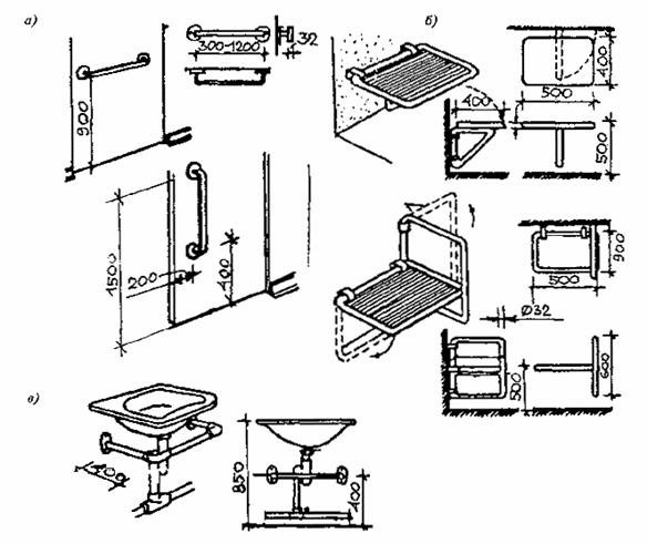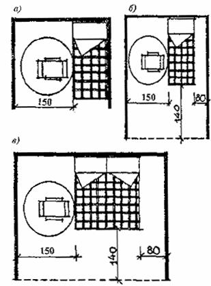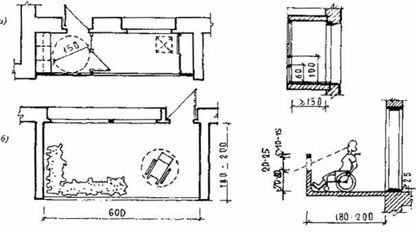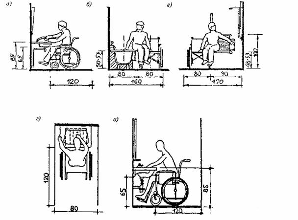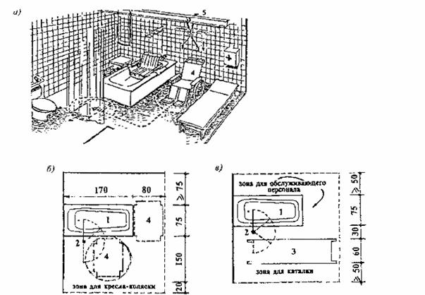 2.4. На участках домов-интернатов должны предусматриваться следующие зоны: жилая, садово-парковая, учебно-производственных мастерских, общественная, хозяйственная, а также необходимые проезды и проходы. 2.5. В составе садово-парковой зоны предусматриваются зеленые насаждения, кольцевые и прямые дорожки, оздоровительные площадки, дорожки для лечебной ходьбы. 2.6. На участке психоневрологических интернатов организуются лечебно-производственная и общественная зоны. Здесь размешаются лечебно-производственные мастерские (слесарные, столярные, сборки радио- и электроаппаратуры и пр.), клубные помещения, столовая, медицинский пункт. 2.7. В хозяйственной зоне предусматриваются: гараж, стоянка автомобилей, трансформаторная, площадка для остановки и выгрузки автотранспорта, площадка для сушки белья, а при необходимости котельная, баня-прачечная, склад, овощехранилище, помещение для содержания скота. В эту зону предусматривается отдельный въезд. 2.8. Площадки, предназначенные для отдыха, настольных игр, занятий трудом на воздухе, оборудуются скамейками, беседками, теневыми навесами и др. 2.9. Площадка для лечебной физкультуры предназначена для проведения лечебной гимнастики, несложных физкультурных занятий и подвижных игр, для которых рекомендуется предусматривать зеленую лужайку; размер площадки для 50 - 70 человек, занимающихся лечебной физкультурой, - 150 м2, для 100 чел. - 250 м2. 3. ОСНОВНЫЕ ЭЛЕМЕНТЫ ПОМЕЩЕНИЯ ДЛЯ ХРАНЕНИЯ КОЛЯСОК3.1. В специальных квартирных домах с обслуживанием и домах-интернатах рядом с вестибюлем или в подвале предусматривается специальное помещение для хранения кресел-колясок (рис. 1). Для удобства инвалидов помещение дополнительно оборудуется специальными креслами, с помощью которых инвалид может пересесть из кресла в велоколяску (электроколяску) и наоборот. Площадь зоны пересадки с помощью специального кресла - 4,4 м2. Площадь зоны пересадки без специального кресла - 3,6 м2. Рис. 1. Помещение для хранения колясок в специальных домах (а) и жилой квартире (б) 1 – вело (электро) коляска; 2 - кресло-коляска; 3 - кресло для пересадки; 4 - поручень; 5 - трапеция САНИТАРНЫЕ УЗЛЫ3.2. Планировочное решение санитарных узлов должно позволять устанавливать в них оборудование в соответствии с индивидуальными запросами и физическим состоянием инвалида (рис. 2, 3). Умывальник и рукомойник рекомендуется устанавливать на высоте 85 см от уровня пола. Унитаз устанавливается с учетом расположения верха сидения на высоте 50 см от уровня пола (на уровне сидения кресла-коляски). Рис. 2. Минимальные планировочные размеры санузлов а, б - раздельный санузел для квартир из двух комнат и более; в, г - совмещенный санузел с ванной или душем для однокомнатных квартир; д - совмещенный санузел с душем для квартир в специальных домах с обслуживанием; 1 - пересадочная площадка; 2 - смеситель с душем на гибком шланге; 3 - трап; 4 - металлический полоз (рельс); 5 - место для стиральной машины; 6 - поручни; 7 - ручки для закрывания дверей; 8 - откидная скамейка 3.3. Рекомендуемый набор оборудования совмещенного санитарного узла (душ, умывальник, унитаз), устанавливаемого в квартирах специализированных домов, показан на рис. 4. Рис. 3. Размеры функциональных зон а - высота установки умывальника, необходимая для подъезда кресла-коляски (вертикальный сифон); б - зона, необходимая для пересадки 