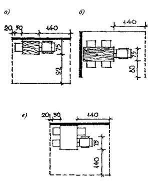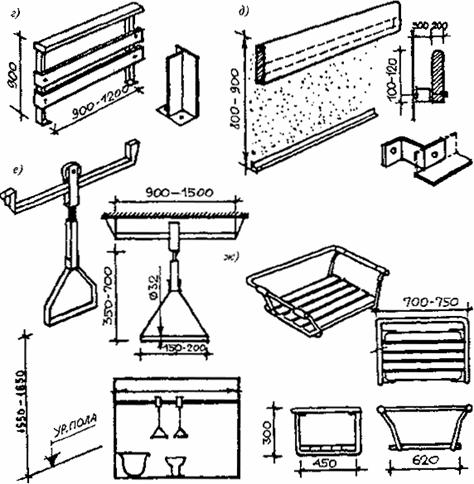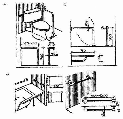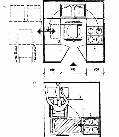 Рис. 6. Специальное оборудование санитарных узлов в жилых домах а - удлиненная дверная ручка для облегчения открывания двери; б - сидение откидное для душа; в - отбойная защитная труба, устанавливаемая вокруг умывальника при подъезде инвалида на кресле-коляске; г - напольный поручень-ограничитель; д - перила настенные; е - трапеция для подъема с помощью рук и пересадки на унитаз или в ванну; ж - сидение съемное 3.5. Рекомендуемое функционально-планировочное решение санитарного узла для престарелых и инвалидов, нуждающихся в посторонней помощи, показано на рис. 7. Перенос инвалида с кресла-коляски осуществляется с помощью штанги (рельса) и трапеции, гидравлического (электро) подъемника или на каталке. Рис. 7. Функционально-планировочное решение санитарного узла а - пересадка с помощью штанги и трапеции; б - то же, подъемника; в - то же, каталки и подъемника; 1 - ванна; 2 - подъемник; 3 - каталка; 4 - кресло-коляска; 5 - штанга и трапеция БАЛКОНЫ И ЛОДЖИИ3.6. При проектировании лоджий минимальная ширина должна устанавливаться из расчета поворота кресла-коляски на 360°. При квартирах, размещаемых на первом этаже, целесообразно предусматривать лоджии (террасы) с выходом на приквартирный участок, который желательно закрывать от посторонних взглядов декоративными стенками-экранами или подсадкой кустарника (рис. 8). Рис. 8. Лоджии а - с частичным остеклением; б - лоджия-терраса При сплошном ограждении лоджии необходимо предусматривать просвет на расстоянии 600 - 750 мм от пола с целью обеспечения визуальной связи с окружающим пространством. Разница уровней полов жилого помещения квартиры и лоджии (балкона) должна составлять не более 2 - 2,5 см. КУХНИ3.7. Рекомендуемое функционально-планировочное решение кухонь различного типа и размещение встроенного оборудования при движении инвалида на кресле-коляске показано на рис. 9. Площадь кухни рекомендуется принимать в однокомнатных квартирах - не менее 8 м2, а в двухкомнатных квартирах и более не менее 9 м2 (в квартирах для инвалидов-колясочников - не менее 12,0 м2). В случае если площадь кухни меньше указанной величины, целесообразно объединять кухню с общей комнатой квартиры. Рис. 9. Функционально-планировочное решение кухни 3.8. Для рационального и удобного размещения основного оборудования в кухнях квартир различного типа при их использовании инвалидами на креслах-колясках кухонное оборудование устанавливается, как правило, консольного типа с учетом беспрепятственного подъезда и досягаемости инвалидом на кресле-коляске (рис. 10). Рис. 10. Рациональное размещение оборудования на кухне а - рабочий стол оборудуется выдвижными ящиками; б - размещение мойки и шкафа-сушилки для посулы; в - рабочий стол консольного типа и навесной шкаф 3.9. Для однокомнатных квартир может быть рекомендована кухня-ниша с минимальной площадью 4,5 - 5,0 м2 (рис. 11) при П-образном расположении кухонного оборудования консольного типа. Обеденное место размещается в жилой комнате и связано с кухней раздаточным окном. Расстояние между параллельным фронтом оборудования рекомендуется делать не менее 0,9 м. При этом инвалид, поворачиваясь на кресле-коляске вокруг своей оси, может достать рукой любой предмет на столе, в шкафу и на полке. Рис. 11. Кухня-ниша а - П-образное размещение оборудования; б - то же, угловое; 1 - мойка, 2 - плита; 3 - рабочий стол Расположение обору