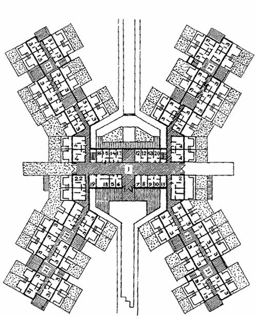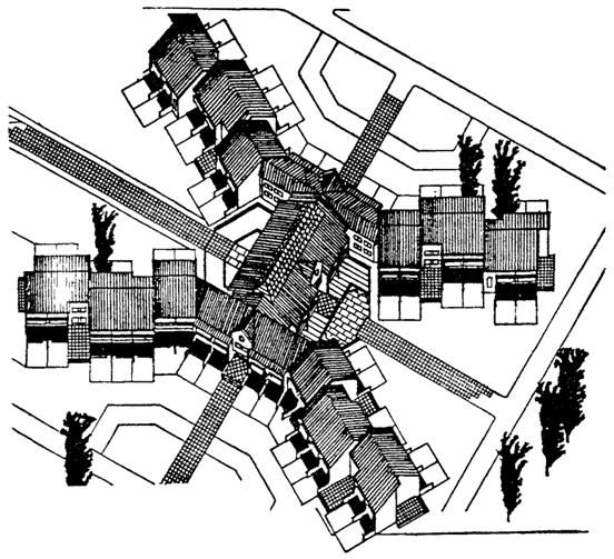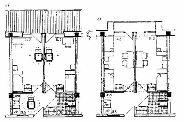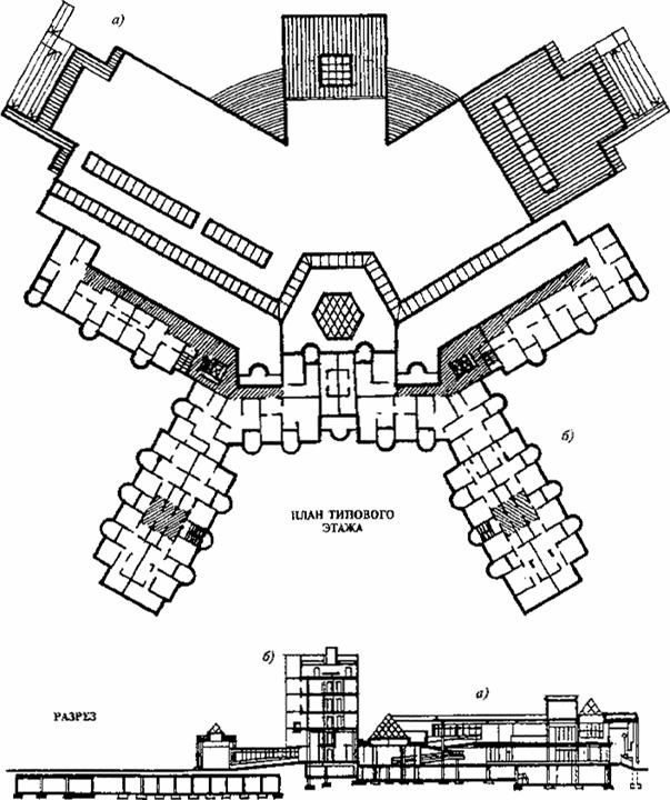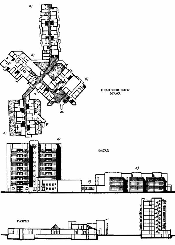 Рис. 3. Специализированный жилой комплекс для престарелых (квартирный жилой дом с обслуживанием + дом-интернат + центр обслуживания), (проект МНИИТЭПа) а - дом-интернат с жилыми комнатами на одного и двух человек; б - центр обслуживания, включающий общественные и медицинские помещения, предназначенные для обслуживания людей, проживающих в комплексе; в - специальный квартирный жилой дом с одно-, двухкомнатными квартирами