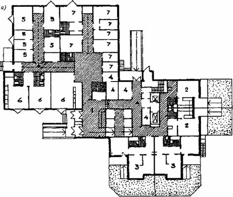 Рис. 4. Девятиэтажный специальный жилой дом квартирного типа с обслуживанием для престарелых и инвалидов в Москве (проект МНИИТЭПа) а - план первого этажа жилого дома; б - план типового этажа жилой секции; 1 - вестибюль; 2 - однокомнатная квартира для инвалида на коляске; 3 - то же, двухкомнатная ; 4 - помещения администрации; 5 - медицинский пункт; 6 - помещения для трудовой деятельности; 7 - отделение надомного обслуживания
