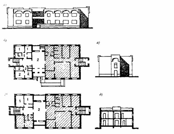Рис. 5. Территориальный центр социального обслуживания пенсионеров (проект ЦНИИЭПжилища) а - главный фасад; б - план первого этажа; в - боковой фасад; г - план второго этажа; д - разрез