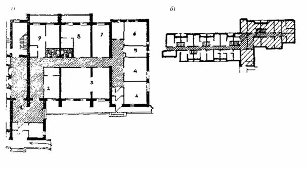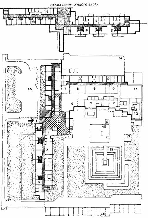 Рис. 6. Отделение надомного обслуживания в составе специального жилого дома (проект ЦНИИЭПжилища) а - фрагмент плана первого этажа специального жилого дома с обслуживанием; б - схема плана жилого дома; 1 - вестибюль; 2 - кабинет директора; 3 - комната отдыха; 4 - мастерские; 5 - кладовая; 6 - постирочная; 7 - стол заказов; 8 - кухня-столовая; 9 - медицинский пункт