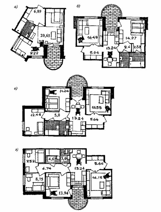 Рис. 7. Планировочные решения квартир различных типов для проживания инвалидов в жилом комплексе а - однокомнатная квартира; б - двухкомнатная квартира; в - трехкомнатная квартира; г - четырех комнатная квартира