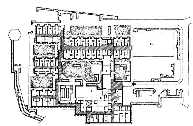 Рис. 8. Комплекс реабилитации в Нурдосе (Норвегия, г. Берген) для инвалидов на кресле-коляске 1 - администрация; 2 - эрготерапия; 3 - физиотерапия; 4 - гимнастический зал; 5 - ванна, душ; 6 - раздевалка; 7 - контора; 8 - кухня; 9 - бассейн; 10 - жилая комната; 11 - комната персонала; 12 - столовая-буфет; 13 - холл-гостиная; 14 - танцевальная площадка; 15 - ванная комната