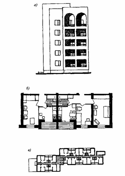 Рис. 9. Специальный 5-этажный 59-квартирный жилой дом для престарелых (типовой проект ЦНИИЭПжилища, 1987) а - боковой фасад; б - план жилых квартир (1А и 2А); в - схема плана типового этажа