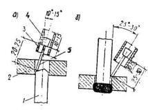 5.4.3. Сборку изделий следует осуществлять, как правило, в кондукторах. Для сохранения перпендикулярности элементов готового изделия одинарные или спаренные стержни перед сваркой нужно собирать "с обратным уклоном", т.е. под угол a = 5-7° (рис.5.14). Конструкция кондуктора должна обеспечивать возможность жесткого закрепления пластин и свободную деформацию стержней.