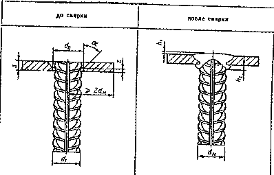 4.3.23. Длина гильз-накладок ориентировочно должна быть равной длине электродов контактных стыковых машин. 4.3.24. Для гильз-накладок пригодны марки стали, применяемые для плоских элементов закладных изделий (раздел 2.4), но соответственно прокатанные в стержни или соответствующие заготовки труб. 5. СВАРКА ЗАКЛАДНЫХ ИЗДЕЛИЙ ЖЕЛЕЗОБЕТОННЫХ КОНСТРУКЦИЙОбщие положенияГОСТ 14098-91 регламентирует 13 конструктивных решений сварных соединений арматурных стержней с плоскими поверхностями металлопроката (листового, сортового или фасонного), выполняемых с использованием электродуговых и контактных способов механизированной и ручной сварки при изготовлении закладных изделий. Закладные изделия, как правило, состоят из элементов металлопроката и анкерных арматурных стержней, приваренных перпендикулярно к их плоской поверхности или внахлестку. Такие закладные изделия условно относят к сварным в отличие от штампо-сварных, в которых на плоской поверхности металлопроката имеются сферические выступы, с помощью которых формируют тавровые или нахлесточные сварные соединения закладных изделий. Штампованные закладные изделия, изготовляемые без применения сварки, а также закладные изделия, изготовляемые сваркой только элементов металлопроката (без арматурных стержней), в данном разделе не рассматриваются. Сварные закладные изделия5.1. Сварка под флюсом тавровых соединений5.1.1. Конструкция и размеры тавровых соединений арматурных стержней с плоской поверхностью металлопроката, выполняемых под флюсом, типа T1-Mф и Т2-Рф, должны соответствовать приведенным на рис.5.1 и в табл.5.1.