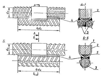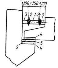 1 - сварное соединение; 2 - стальная скоба: 3 - накладка: 4 - протяжные швы; 5