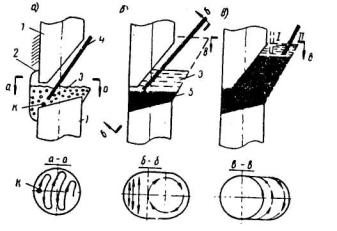 Примечания: 1. Значение временного сопротивления срезу в соединениях КЗ-Рр не нормируется. 2. Эксплуатационные характеристики этих соединений при растяжении рабочих стержней приведены в приложении 2. 4.2.2. Сварные соединения типа К3-Рр в арматурных стеках, каркасных и иных изделиях являются нерасчетными и должны обеспечивать конструктивные размеры изделий и их транспортабельность вплоть до бетонирования. 4.2.3. Дуговую сварку таких соединений следует выполнять электродами, приведенными в разделе 3.3 и приложении 5, рекомендованными для сварки соответствующих классов и марок арматурной стали на минимальных токах, величина которых в зависимости от диаметра указана в паспортных данных на электроды. 4.2.4. Изделия с крестообразными соединениями, выполняемыми дуговой сваркой (прихватками), следует собирать в кондукторах, применяя электроды диаметром 4-5 мм, обеспечивая прижатие пересекающихся стержней таким, чтобы отсутствовали зазоры между ними (рис.4.7). Выполнение дуговых прихваток должно производиться "короткой дугой" (сопровождаться "сухим" характерным потрескиванием) с незначительным перемещением электрода вдоль места соприкосновения стержней арматуры и заканчиваться постепенным уменьшением длины дуги, без образования кратера - источника возникновения кристаллизационных трещин. 4.2.5. Крестообразные соединения стержней могут выполняться также механизированной сваркой самозащитной порошковой проволокой характеристики которой приведены в табл.3.1. Сварочные полуавтоматы следует выбирать исходя из рекомендаций табл.6 приложения 6. 4.2.6. Допускается механизированная сварка крестообразных соединений стержней проволокой сплошного сечения в среде углекислого газа. 4.2.7. Техника сварки для всех приведенных технологических процессов примерно одинакова и в значительной мере зависит от квалификации и индивидуальных возможностей рабочего-сварщика. Основным следует считать то, что в случае, если изделие (сетка, каркас) расположены в горизонтальной плоскости, верхними и, как правило, нерабочими стержнями, должны быть стержни меньшего диаметра. Электрод (сварочную проволоку) следует располагать под углом α ≈ 30-40° к горизонтальной плоскости, направляя его торец в угол, образованный пересекающимися стержнями, перемещая торец электрода на величину l = 0,5d'н , но не менее 8 мм. Такие швы-прихватки накладываются с двух сторон стержня меньшего диаметра арматуры. Если по техническим условиям производства арматурное изделие собирается, а затем сваривается в вертикальном положении, сварку следует выполнять со стороны рабочей арматуры, т.е. со стороны арматуры большего диаметра. В этом случае оба шва-прихватки выполняются в вертикальной плоскости справа и слева от рабочей арматуры. Швы накладываются снизу вверх, кратеры тщательно завариваются. В том случае, если выполнить сварку оказывается невозможным, швы наплавляются со стороны меньшего стержня, но при этом нижний шов приходится наплавлять в потолочном положении. Сварка таких соединений требует высокой квалификации работающих. 4.2.8. В виде исключения крестообразные