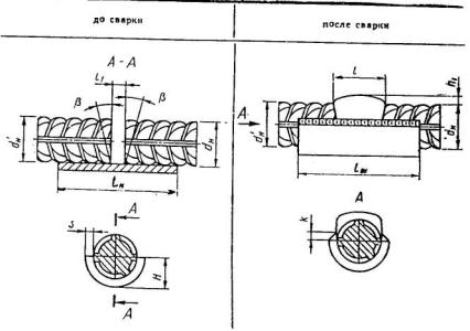 5.5.2. Изготовление закладных изделий по п.5.5.1 следует выполнять на специализированных машинах типа К-774*, которые обеспечивают полную автоматизацию процесса сварки для стержней диаметрами 14, 16, 18 и 20 мм (т.е. в основном для закладных изделий, применяемых в промышленном строительстве). Условия сварки на этом специализированном оборудовании излагаются в инструкции по ее применению и эксплуатации. * Изготовители: Псковский завод тяжелого электросварочного оборудования; Институт электросварки им. Е.О.Патона. 5.6. Ручная дуговая сварка нахлесточных соединений стержней с плоскими поверхностями стального проката5.6.1. Конструкция и размеры нахлесточных соединений арматуры с плоскими поверхностями проката должны соответствовать приведенным на рис.5.17 и в табл.5.10.