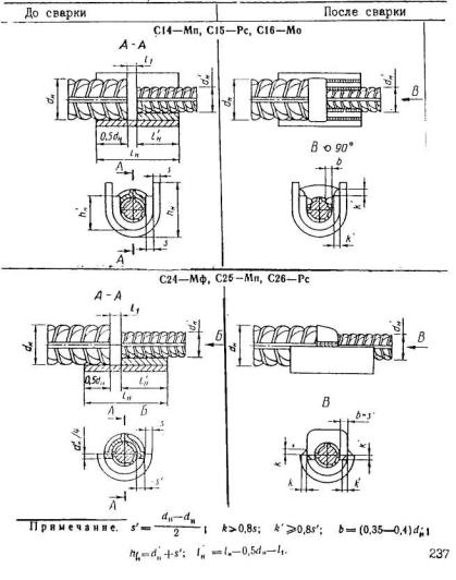 срезывающих усилий. Для обеспечения условия, при котором 4.2.9. Не допускается сварка крестообразных соединений стержней с нормируемой прочностью при отрицательной температуре. 4.3. Контактная сварка стыковых соединения стержней4.3.1. Контактную сварку стыковых соединений следует применять: - для соединения арматурных стержней при их заготовке с целью последующей безотходной резки; - для реализации отрезков арматуры; - для приварки к рабочей арматуре отрезков большего диаметра в целях обеспечения возможности последующей сварки выпусков при монтаже железобетонных конструкций. 4.3.2. Стыковые соединения арматуры типов C1-Ко, С2-Кн, С3-Км и С4-Кп, представленные на рис.4.8, 4.9, в табл;4.5, 4.6, следует выполнять способом непрерывного оплавления или оплавлением с предварительным подогревом на машинах, типы которых следует выбирать по табл.4 приложения 6.