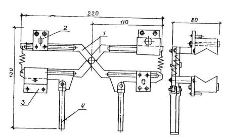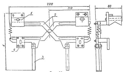 1 - планка крепления пьезопреобразователей; 2 - рычаги; 3 - рукоятка; 4 -