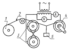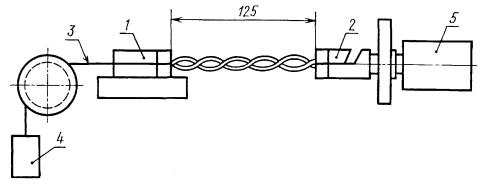 напряжения должна быть практически синусоидальной с коэффициентом амплитуды - установка для испытания, в которую входят два полированных металлических свободно вращающихся на осях валика диаметром 30 мм, расстояние между центрами валиков 55 мм; - установка для испытания должна соответствовать технической документации, утвержденной в установленном порядке. Схема установки указана на черт. 1. 1 - катушка с проводом; 2 - испытуемый провод; 3 - металлические валики; 4 - зажимы; 5 - груз Черт. 1 Установка содержит набор грузов, обеспечивающих соответствующее натяжение провода на металлических валиках. (Измененная редакция, Изм. № 3, 4). 2.2. Для испытания проводов круглого сечения с медной проволокой диаметром 0,315 мм и более с эмалево-волокнистой (за исключением эмалево-стекловолокнистой) изоляцией должна быть применена следующая аппаратура: - установка переменного тока частоты 50 Гц на напряжение св. 1000 В, состоящая из трансформатора мощностью не менее 1,0 кВ×А, регулирующего устройства и измерительных приборов. Форма кривой напряжения должна быть практически синусоидальной. Пробивное напряжение должно быть измерено с погрешностью не более ± 2,5 %; - устройство для скручивания проводов, соответствующее технической документации, утвержденной в установленном порядке. Схема устройства указана на черт. 2. Устройство содержит набор грузов, обеспечивающий соответствующее натяжение проводов при их скручивании. 2.3. Для испытания проводов со стекловолокнистой, эмалево-стекловолокнистой, дельтаасбестовой и пленочно-волокнистой изоляцией должна быть применена следующая аппаратура: - установка переменного тока, соответствующая требованиям п. 2.2. 1 - скользящий зажим; 2 - вращающийся зажим; 3 - образец провода; 4 - груз; 5 - электродвигатель Черт. 2 В установку входит электрод, состоящий из металлических шариков (диаметр 2 и 3 мм, степень точности 60 - 100, группа Н по ГОСТ 3722). Примечание. Диаметр шариков 3 мм до 1 января 1988 г., с 1 января 1988 г. диаметр шариков 2 мм; - устройства для навивания образцов на стержень и для изгиба образцов с углом обхвата стержня 180°, соответствующее требованиям ГОСТ 15634.3. В устройства входит дополнительный комплект цилиндрических стержней из изоляционного материала с предельным отклонением по диаметру ± 10 % от величин, установленных в стандарте или технических условиях на обмоточные провода. Поверхность стержней должна быть гладкой; - термостат с перемешиванием воздуха и автоматическим регулированием температуры с погрешностью, указанной в табл. 1, с токопроводящими выводами для присоединения образцов, находящихся в термостате, к установке напряжением св. 1000 В. Таблица 1 °С